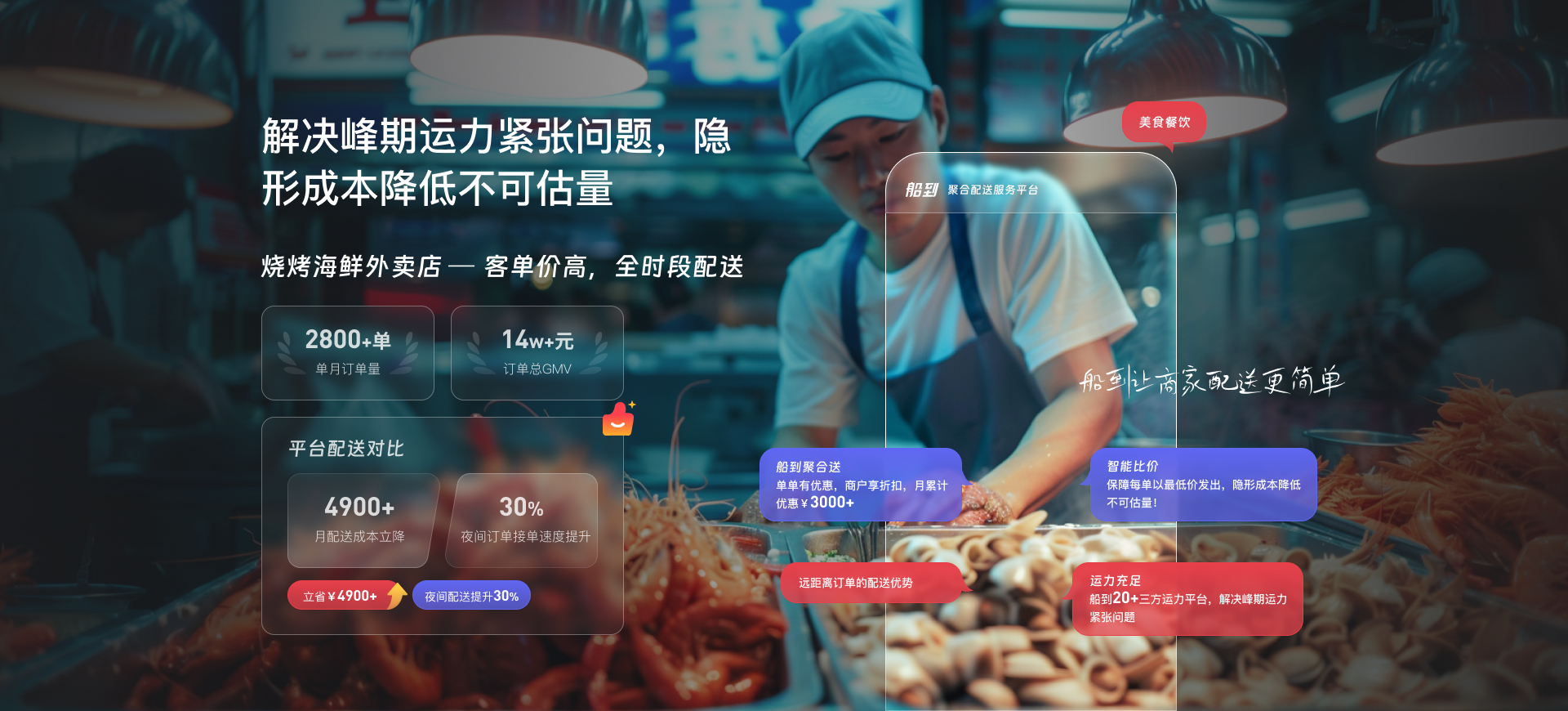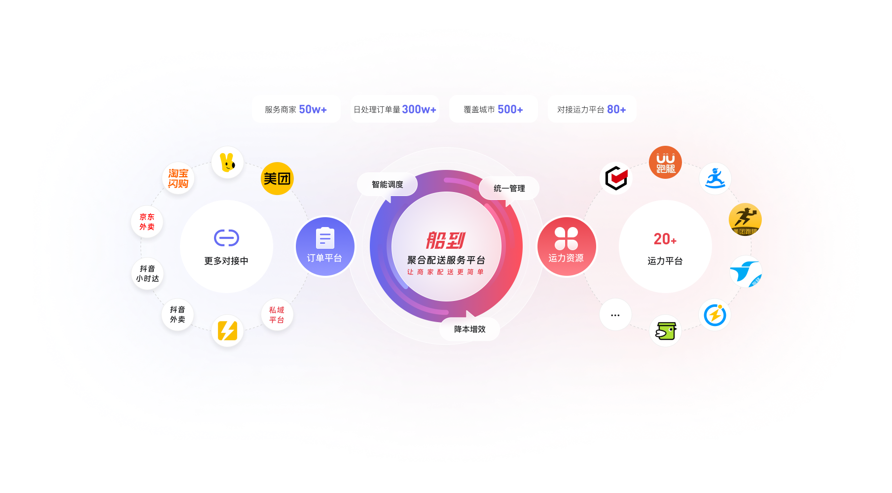 船到聚合配送平台,具有外卖自动接单、自动配送、多渠道订单等管理功能,通过整合美团、饿了么、抖音等订单平台,帮助商家一站式解决多平台订单!