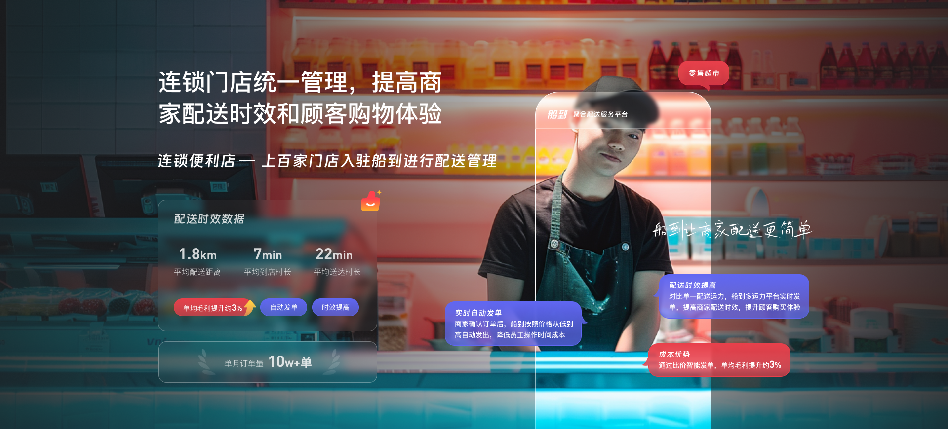 借助船到及时发单,提升商家发单效率,缩短用户等待时间,助力传统实体商超门店短期内在区域实现盈利