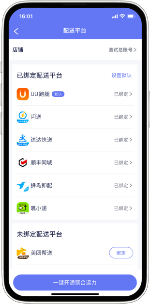 整合市面上的运力资源,多平台一起为商家补充运力。 解决商家高峰期订单配送难、骑手少、配送成本高、配送效率低、自配送需求大以及切换平台繁琐等痛点
