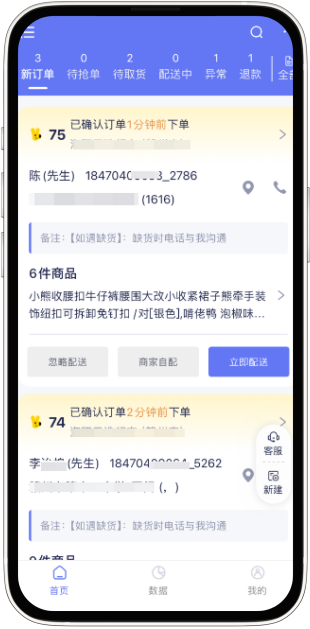订单管理:将您业务系统内的订单导入船到进行配送,免去手动录入订单信息的麻烦,在船到内实现订单聚合管理、自动打印和一键配送操作