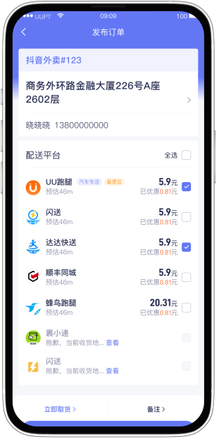 无缝对接美团、饿了么、抖音等订单,商家可指定运力发单,多家比价,省钱省力更便捷!发单更高效!