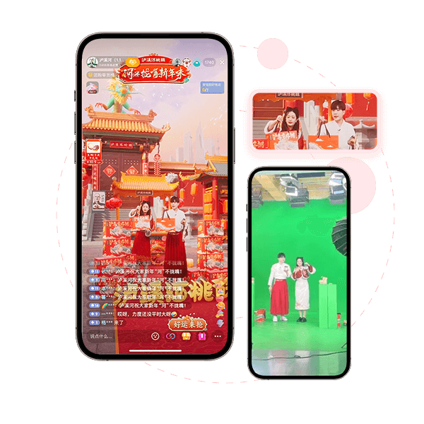 使用了抖捧xr虚拟直播效果,虚拟构建的年货街景、不断燃放的绚丽烟花、满天飘落的红包雨,以及载有泸溪河品牌IP人物“小掌柜”的新年龙在不断地腾飞、盘旋,满屏的画面烘托出满满的新年味和科技感,刚开播在线人数就突破1000人,整场直播下来,团购带货冲到全国周榜第1名,订单总GMV达255万+!