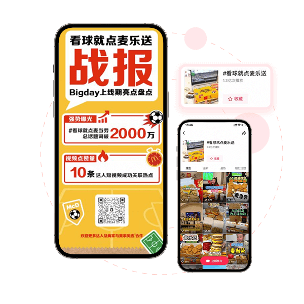 借助FIFA期间节点营销,进行麦乐送首入抖音全网营销,通过“探店达人反卷计划——宅家探店”、“FIFA期间吃什么”等,分级达人BF,针对不同级别达人能力与流量特性,聚合内容与转化双向“品效合一”。最终#看球就点麦乐送话题曝光1.3亿,上线一周话题曝光破2000万+