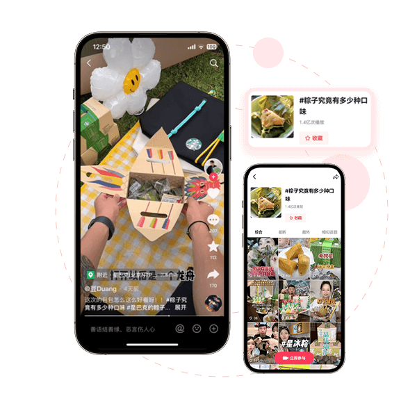 星冰粽一直是星巴克的明星产品,每到5-6月就能在门店里精美的星冰粽产品展示,在线上亦是如此,在小红书等其他种草平台,有不少杯星冰粽颜值臣服的博主与消费者,配合星冰粽首次在抖音生服赛道首次上品,用创意内容将用户的好奇心重新吊起。 星巴克星冰粽——穿搭博主+测评博主,跨界打爆单品。最终#粽子究竟有多少种口味 话题曝光度1.4亿,单品销售额突破2000万