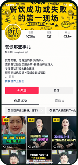 旗下“餐饮那些事儿”“供应链那些事儿”“茶饮研究所”等短视频矩阵账号,自持账号共有全国餐饮商家百万B端受众。