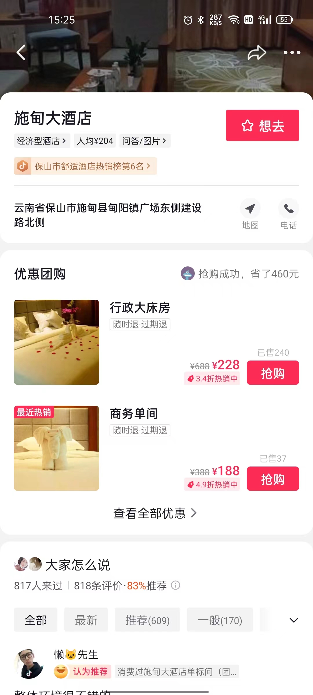 施甸大酒店是在当地县城排行前三名的老牌酒店,品牌本身自带流量,是当地的头部商家。