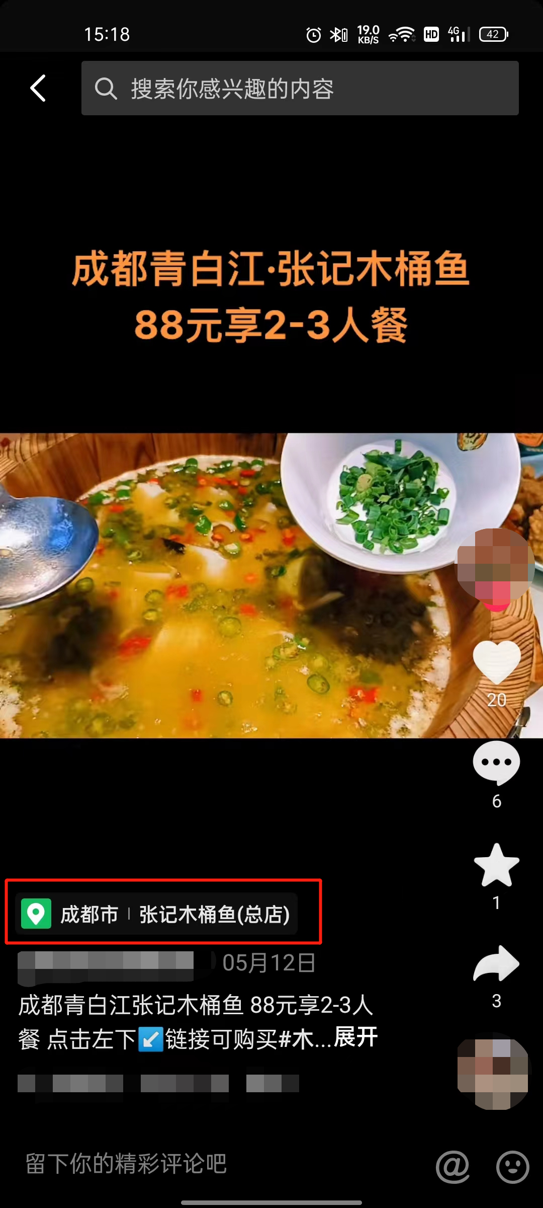 张记木桶鱼(清白江店)是连锁总店,本次做活动上线的就是总店的套餐,只有总店的商品享受折扣价,也就意味着,用户下单折扣套餐后,只能到总店这个门店进行核销,也就给总店直接带来了流量。