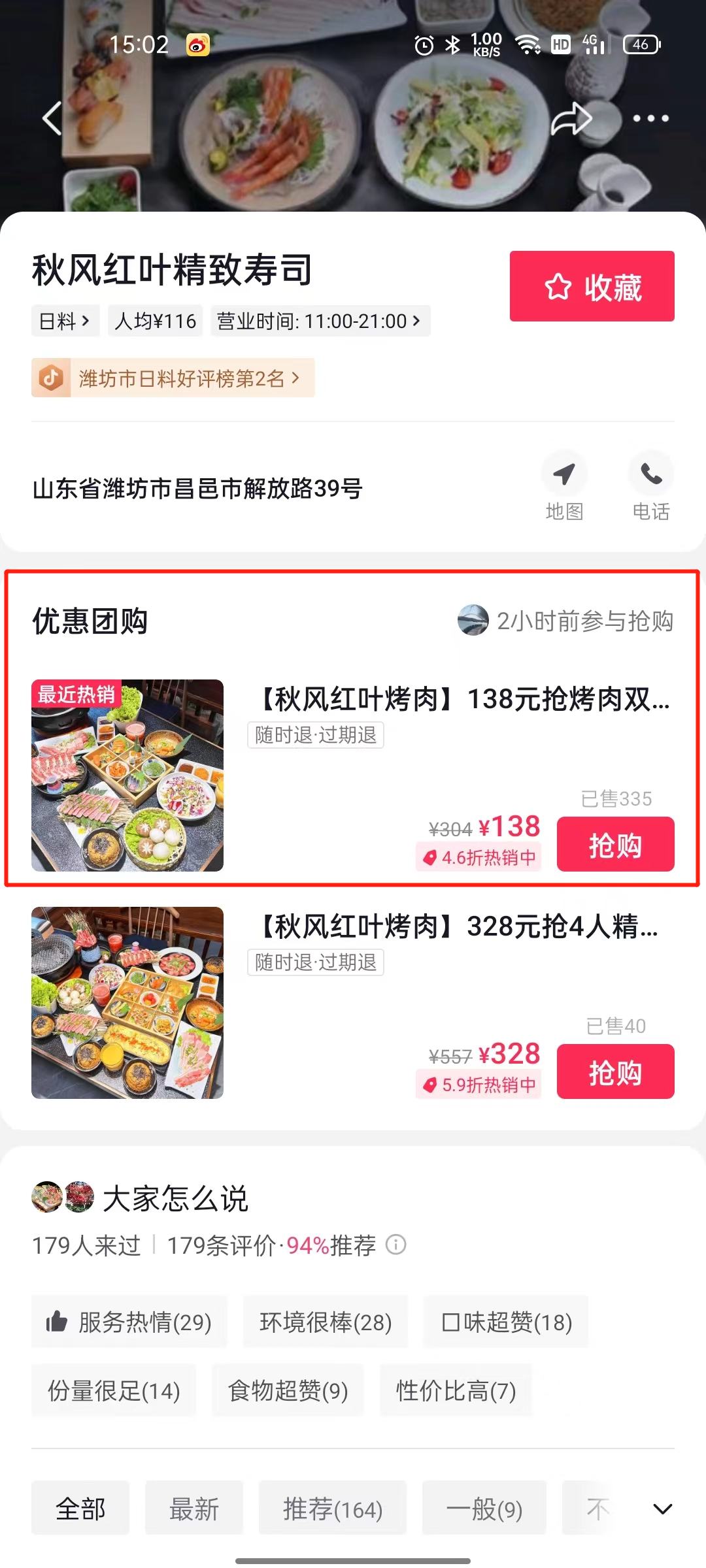 本次的秋风红叶烤肉日料店是在当地小县城的一家日料店,商家自身也不算有名气,尤其在小县城里,覆盖客户群体和消费水平都比较有限。