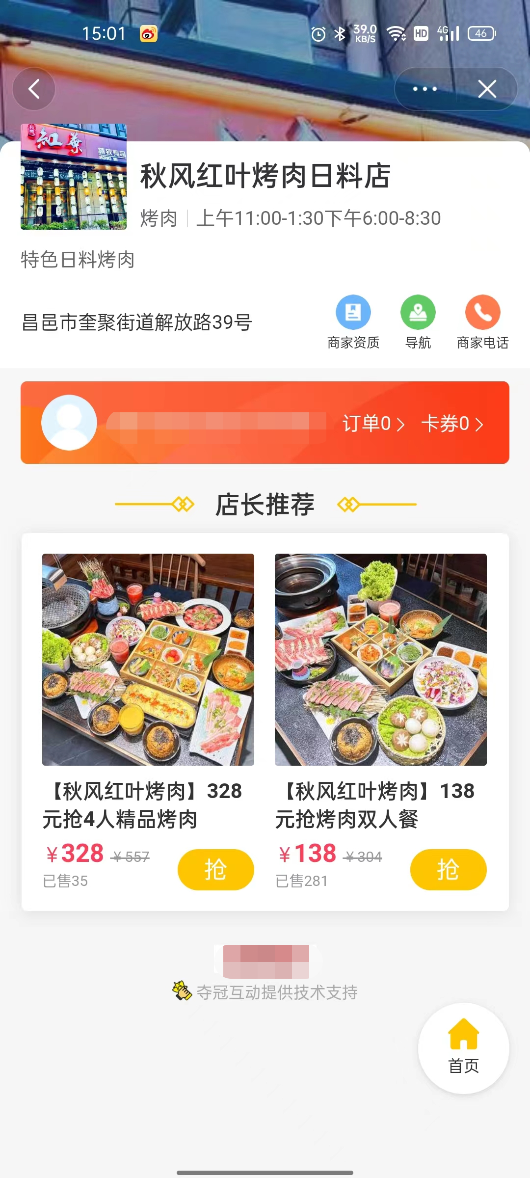 今天就再给大家带来一个【餐饮】行业的案例,是由夺冠生活圈小程序在潍坊的站点打造的,商家名字叫做——秋风红叶烤肉日料店。