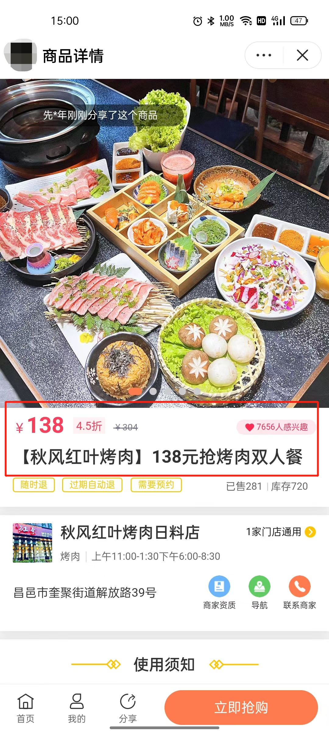 站点为商家上线的套餐内容为【秋风红叶烤肉】138元抢烤肉双人餐,原价304元,团购享4.5折,抢购价为138元。