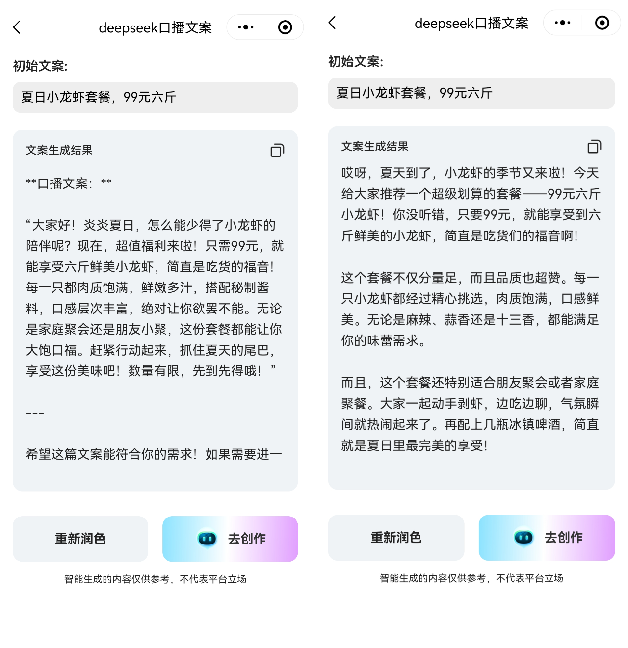 • 智能脚本:结合DeepSeek大模型,输入产品关键词即可生成50版差异化口播文案。
