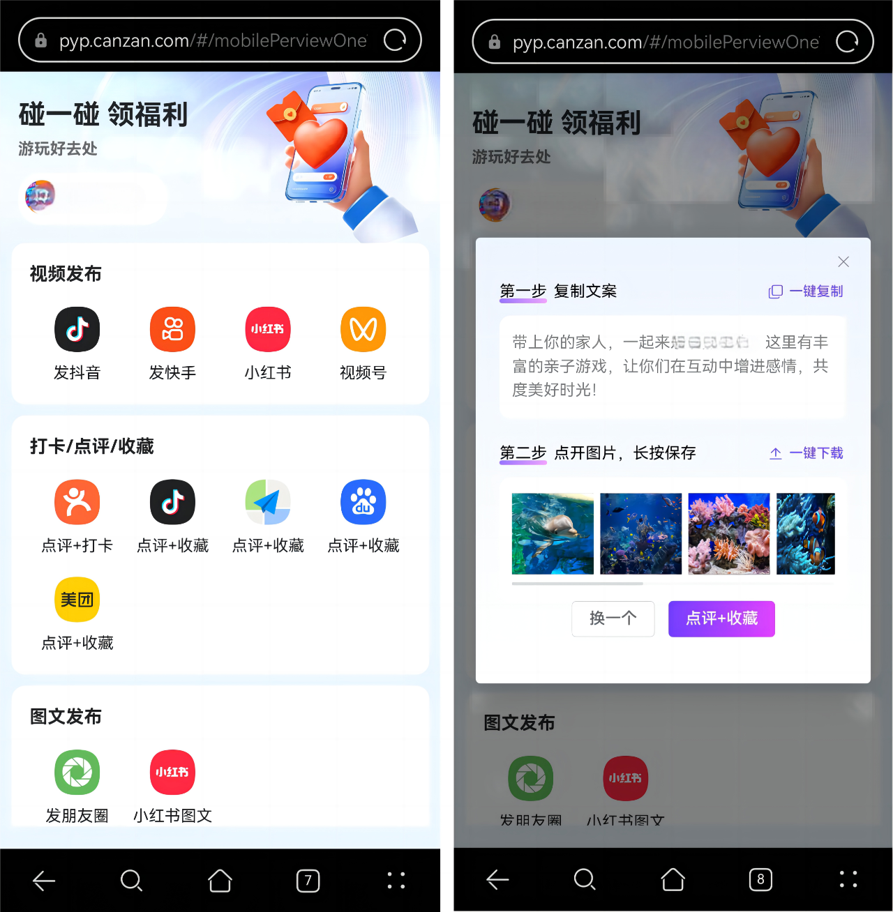 • 互动形式:在游乐场入口、热门展区布置NFC立牌,家长手机轻碰即可:自动生成“亲子探馆视频+趣味文案”;跳转抖音/小红书发布,带话题#**海洋馆#;碰一下发视频领取微信现金红包或抽奖资格(免费儿童票、潜水体验)。