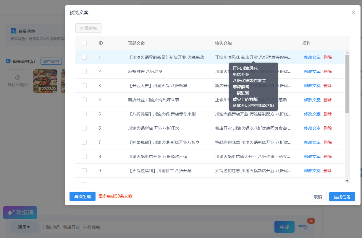 因此,这家火锅店在新店开业之际,果断选择了小魔推进行营销推广。他们上传了丰富的视频素材,包括精美的门头照片、诱人的菜品展示以及舒适的店内环境视频。小魔推迅速发挥作用,生成了大量高质量的宣传视频。