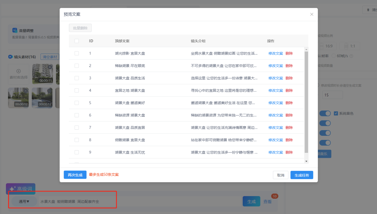 小魔推解决方案:小魔推的三大剪辑能力,一键成片、批量剪辑、镜头剪辑,能满足不同的剪辑需求。其中一键成片功能,只需要将素材片段上传至后台,输入要剪辑的条数,就能直接成品。且输入文案的关键词,就能自动生成视频的标题文案和视频口播文案,连文案都不用写,全程自动化就能快速得到一批高质量视频,即使一点不懂剪辑的小白也能做到,直接解决了房地产企业面临的视频制作难题。