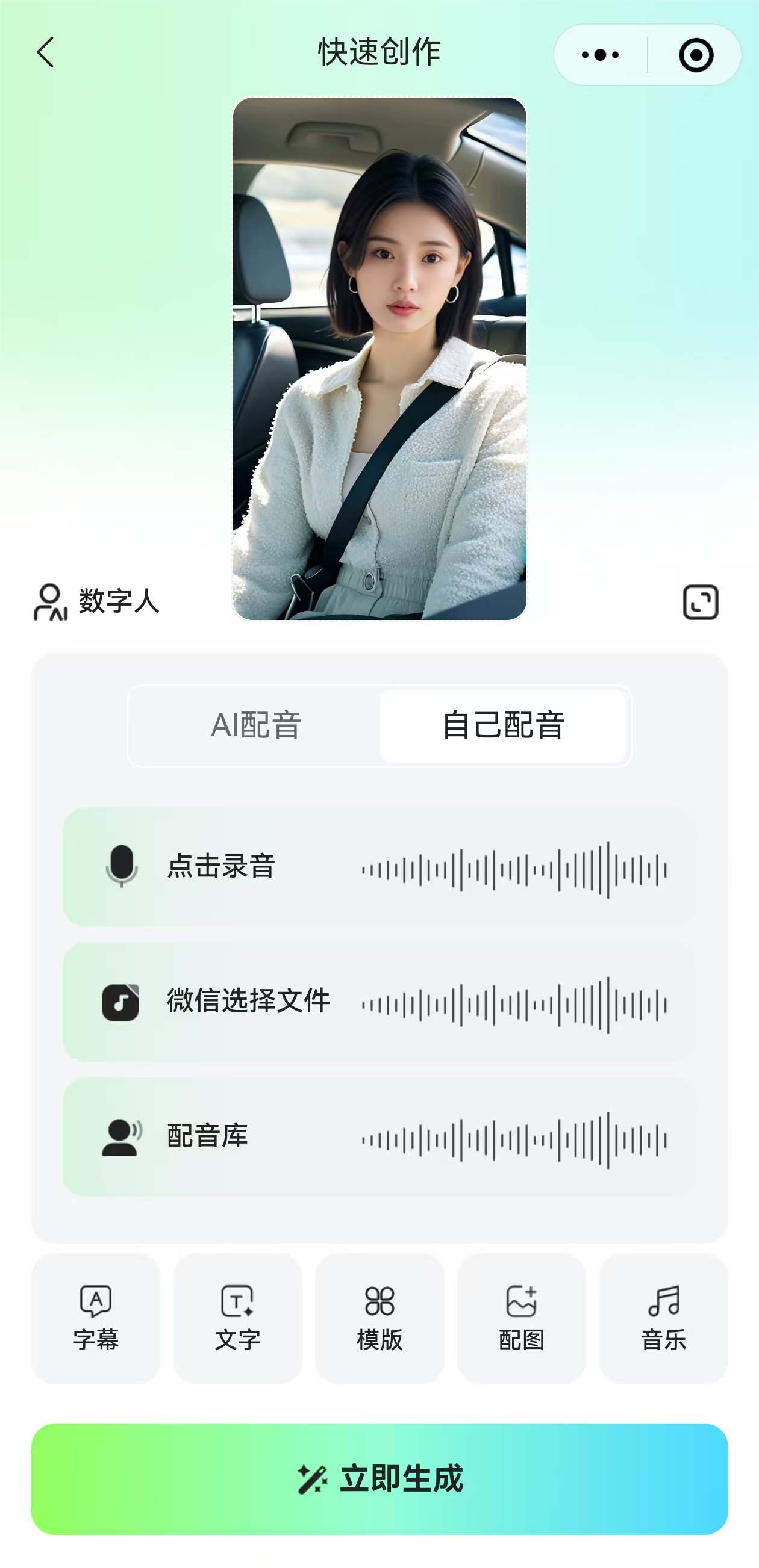 • AI配音:即以文案驱动视频,借助数字人的文案创作生成好视频的口播文案,然后选择自带的配音生成视频。其优势就是简单便捷,无需自己配音。