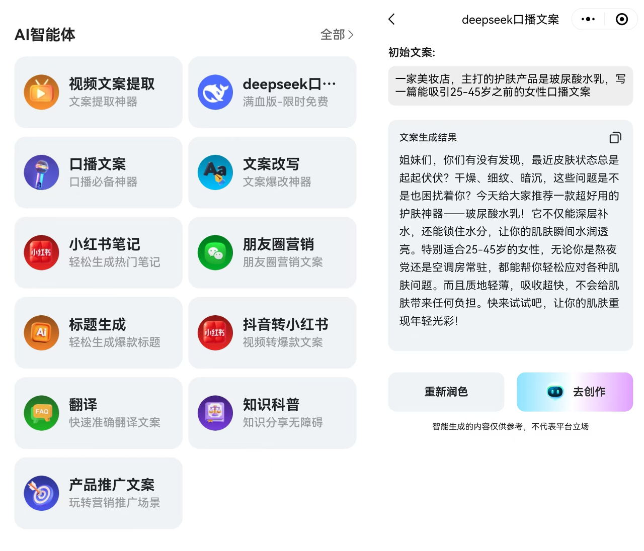 • 文案改写:对已有文案进行智能优化,提升语言表达效果和吸引力。