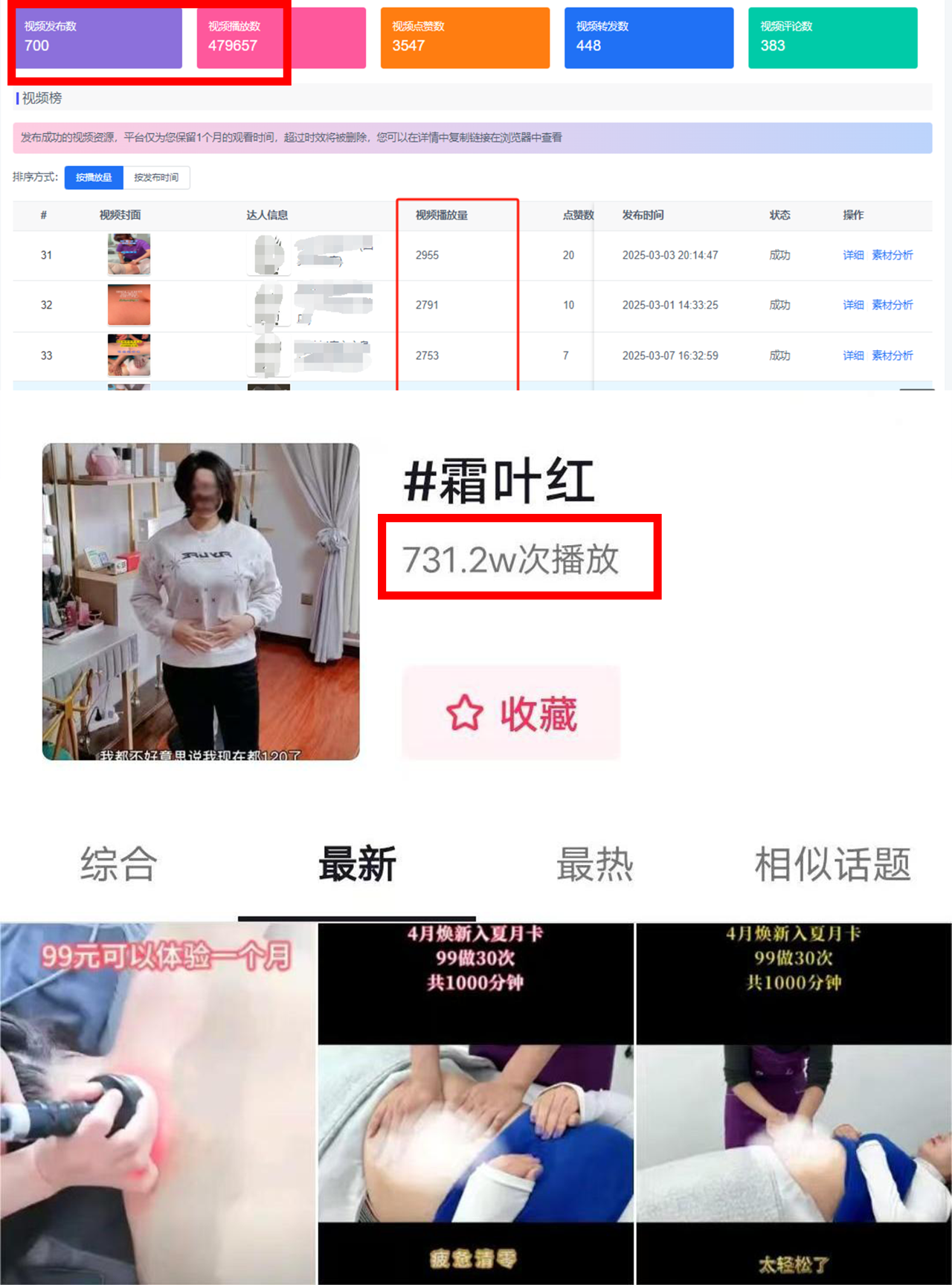 霜叶红减肥按摩瘦身品牌通过小魔推矩阵营销工具,成功实现 700条视频批量生产、47万+视频播放量、731.2万话题曝光,并直接带动团购订单转化。这一案例不仅验证了短视频矩阵营销的高效性,更揭示了生美行业如何通过 “AI+全员营销” 实现低成本、规模化增长。